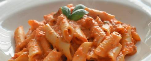 Between meeting Ken for lunch and going out for dinner, I watched an old Ina Garten episode that featured a vodka sauce recipe. I wanted to try it as soon as we got home. The original recipe called for cream, which I substituted with Tofutti sour cream. However, if you have a cashew cream or even some leftover pine nut cream from my previous post it would be even better. I’ve also made it without the cream entirely and it’s still extremely delicious.