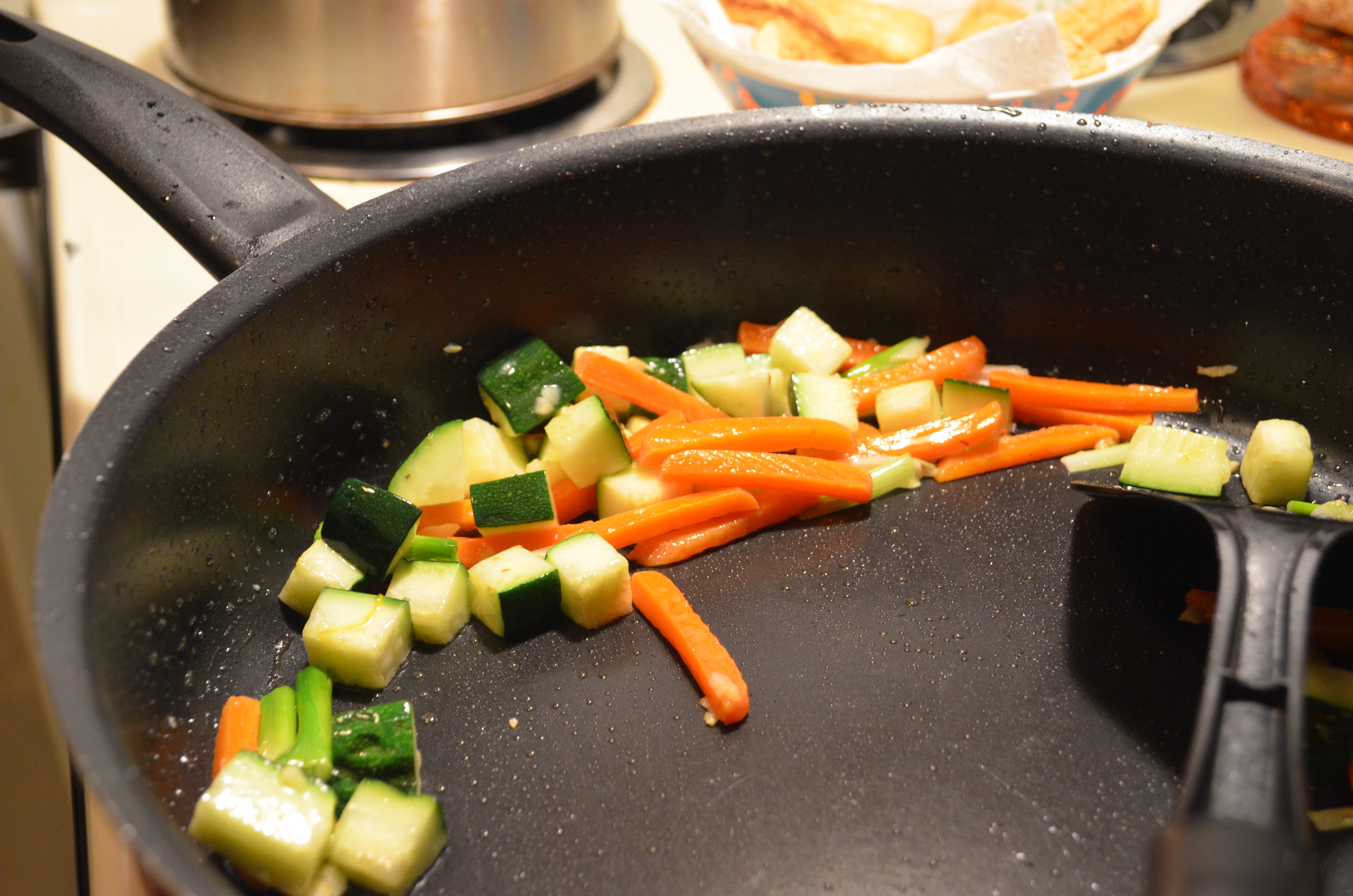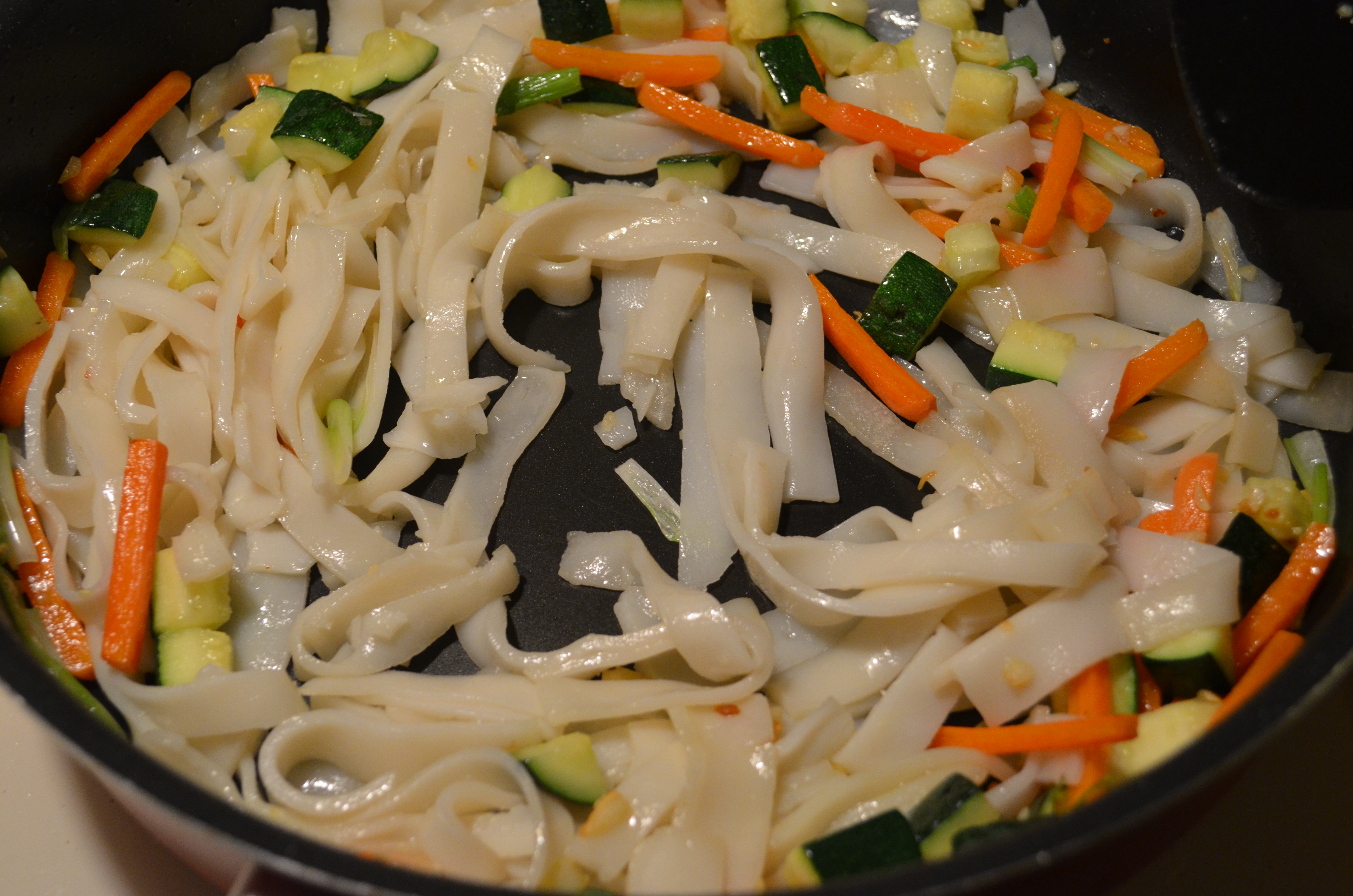 6. When vegetables have softened, add noodles. Stir for several minutes, they will begin to soften.