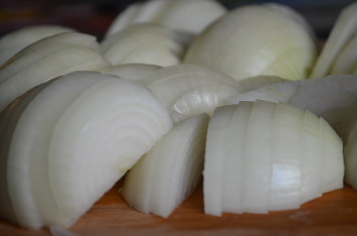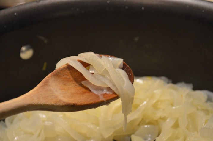 2. Heat olive oil in large sauce pan over medium heat. Saute onions uncovered for about 10 minutes until softened and sweating.