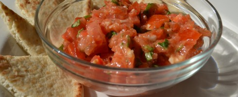 1. Chop tomatoes, removing most seeds. Mince garlic. Tear the basil into small pieces. Combine all ingredients in a bowl and let flavors combine for 1-2 hours. Serve on toasted bread or with warm pita on the back porch on a nice summer day.