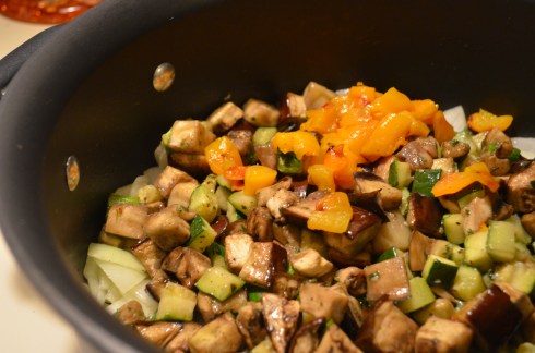 4. Add garlic cloves, breaking up as you them. Also add the eggplant, zucchini, and pepper.