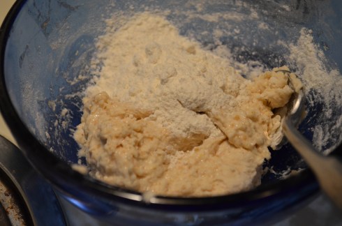 2. Add baking powder, salt and pepper, and about 1/2 cup of flour. Stir until combined, then add about another 1/2 cup. Continue adding small amounts of flour until dough is soft and no longer tacky.