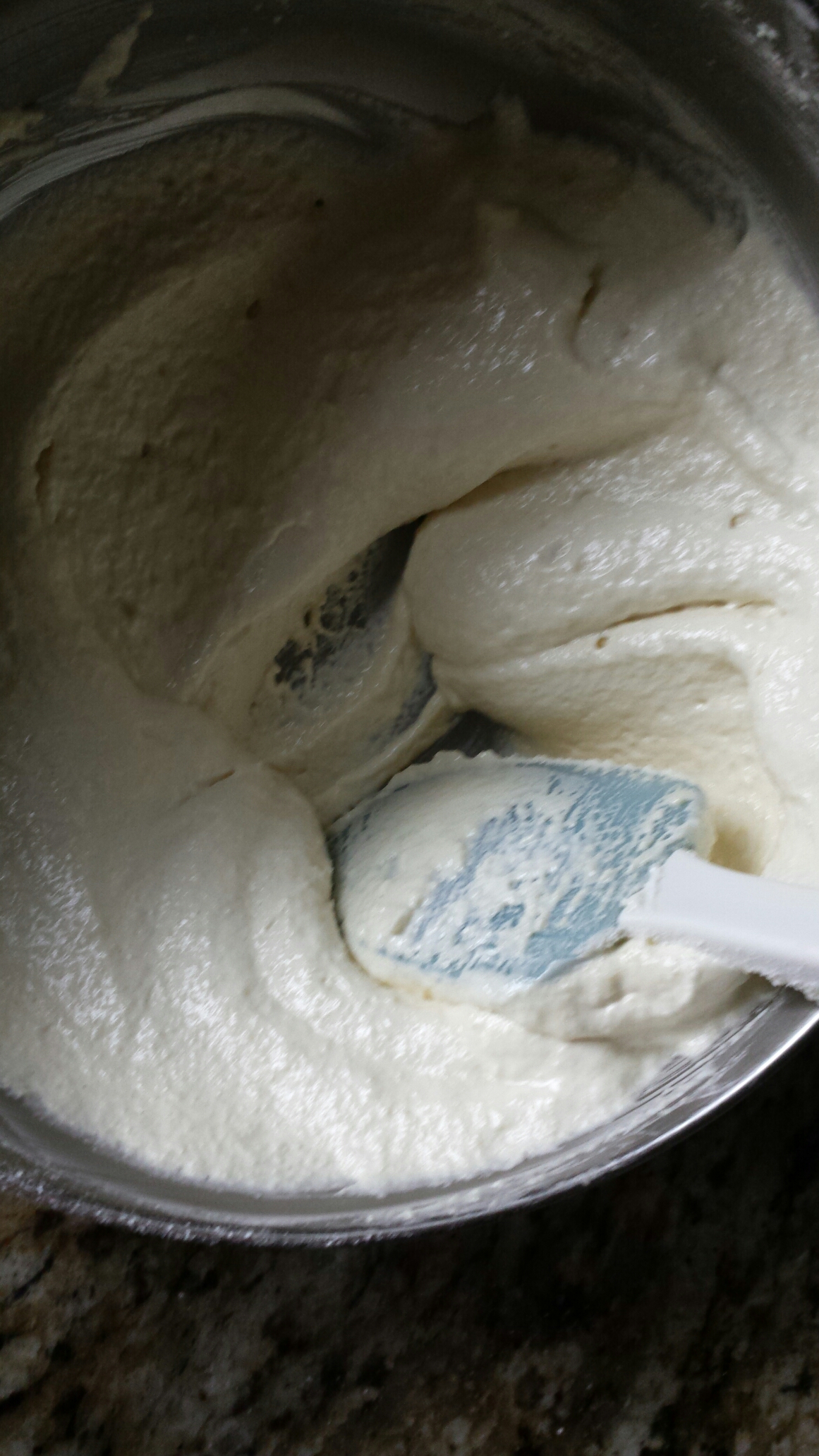 6. Once all of the almond meal is mixed and there are no large streaks of meringue or dry clumps, begin macaronnage. Push the batter against the side of the bowl to deflate and scoop from underneath.