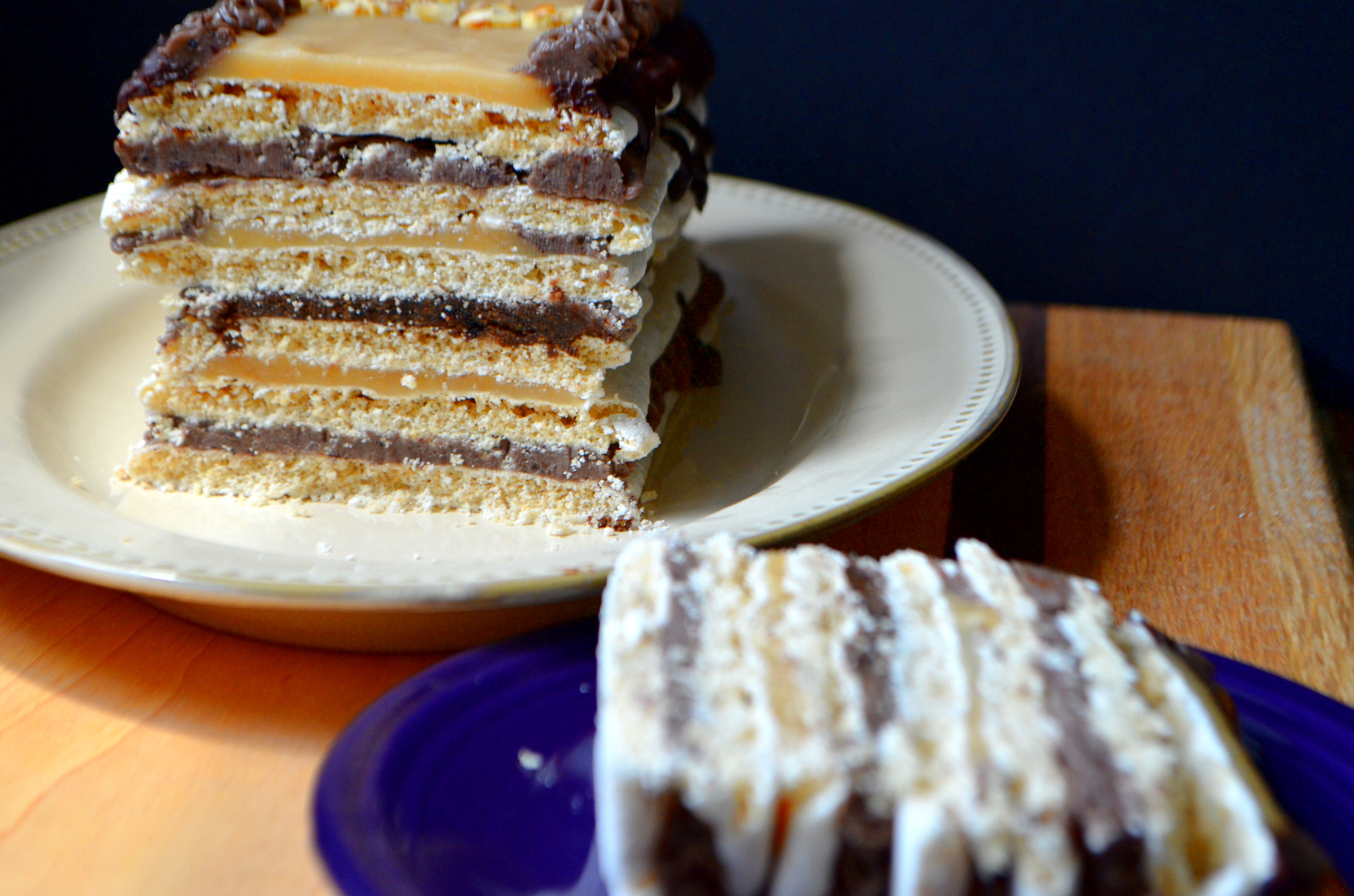 I thought my last dacquoise was going to be the final one, but I couldn’t resist making one more, especially with my parents visiting for my birthday today. Since it is my birthday, I wanted to fill it with a few of my favorite things-caramel, chocolate, frosting, and Nutella. This is not something I would recommend eating everyday. In fact, I would highly recommend only having two pieces then letting someone else finish it, because it’s pretty indulgent.