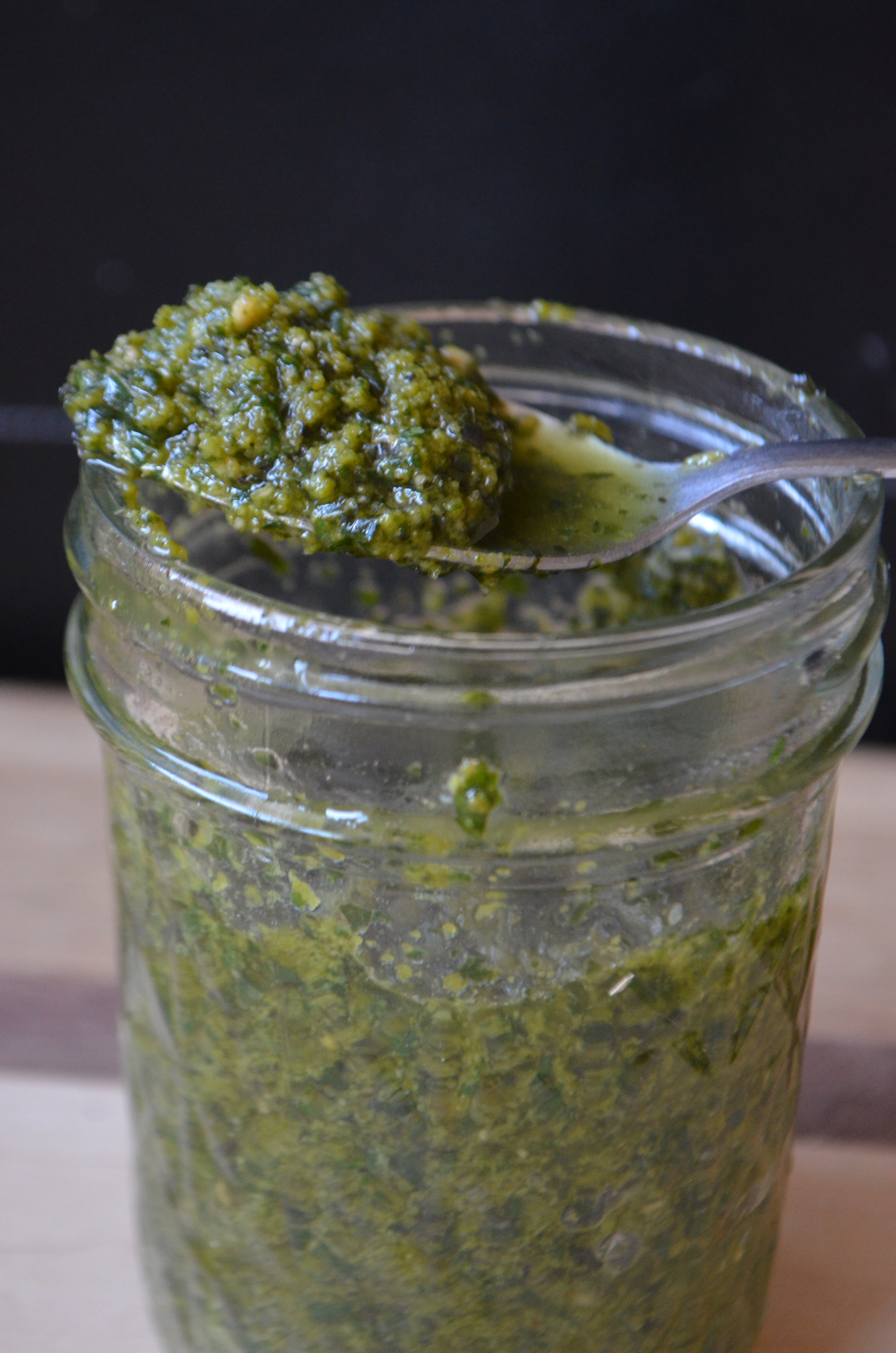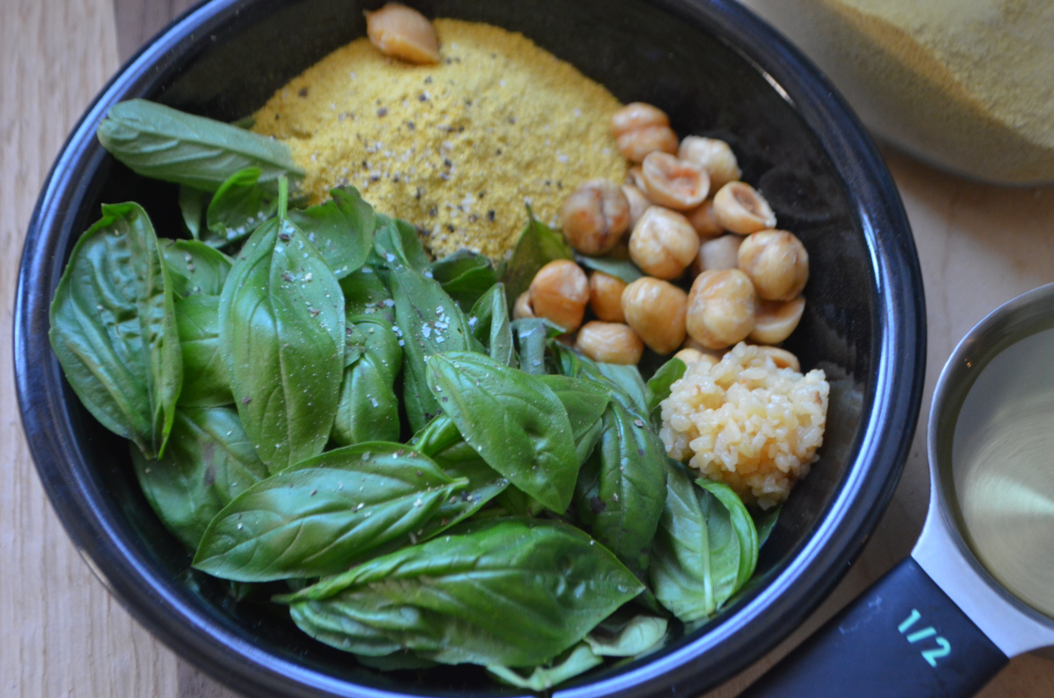 I had leftover roasted hazelnuts from making my dacquoise and I figured “hey, throw them in the pesto, can’t hurt.” It’s been quite a while since I had pine nut pesto, but I can tell the hazelnuts have a different complexity to them. If you don’t have hazelnuts on hand, pine nuts or walnuts would work just as well!