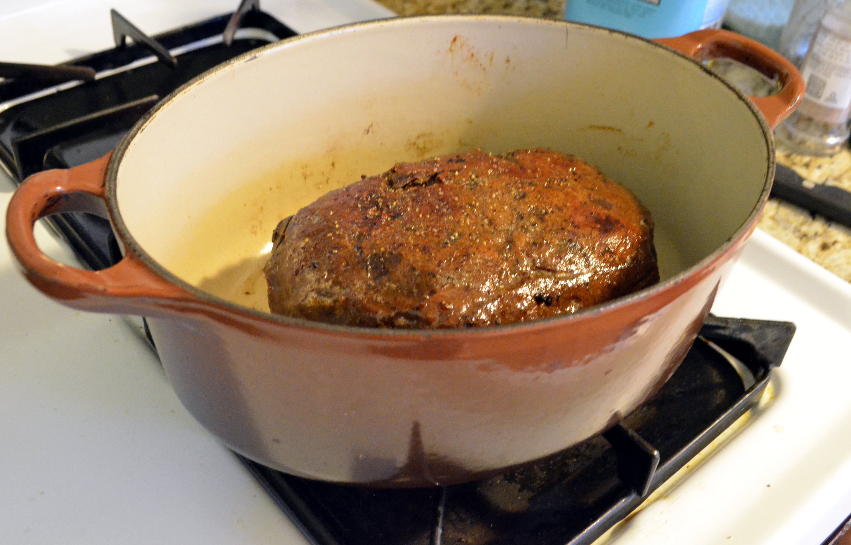 10. When roast has cooled thoroughly, heat a large Dutch oven or similar pan over medium heat. Add 2 tbsp of oil and 2 tbsp of soy sauce and sauté each side of roast until slightly darkened.