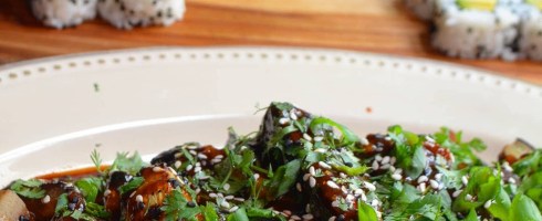The eggplant is simply cooked in a large cast iron skillet with some oil and water until its fully steamed and a bit charred. Then it’s topped with sauce and cilantro and sesame seeds and it’s ready for consumption. I like to serve this with rice or rice noodles, or simply by itself. Let me know if you give it a try!