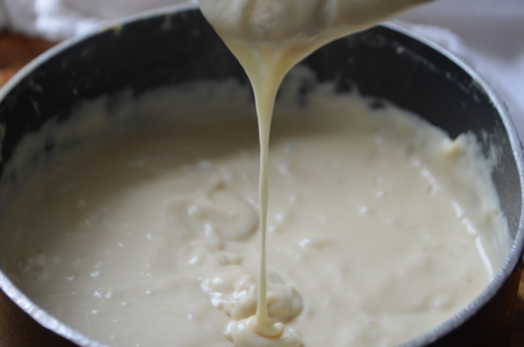 Since tapioca starch and kappa carrageenan have different activation heats, we will need to heat our mixture completely up to above boiling for it to properly set. I cook my cheese over medium heat in a non stick saucepan while constantly stirring to avoid the mixture breaking. The cheese will begin to curdle slowly, then as each starch gets activated, it will smooth out into a creamy, stretchy sauce.