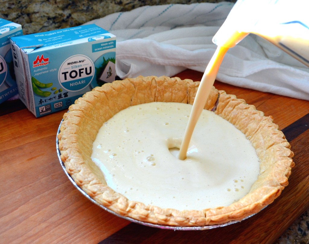 In testing this recipe, I found a combination of starches wasn’t quite enough to set the custard, but then remembered my shelf stable Mori-Nu tofu in the pantry. Suddenly, I realized the combination of tofu, starch, and eggnog was going to be the answer. The creamy texture of Mori-Nu Silken Tofu makes this pie especially dreamy, and adds complete plant-based protein to the end product. Plus, the flavor of the tofu perfectly blends with eggnog without overpowering it. I’m always sure to drain my tofu before using, as added liquid in this recipe can make the pie not able to set properly.