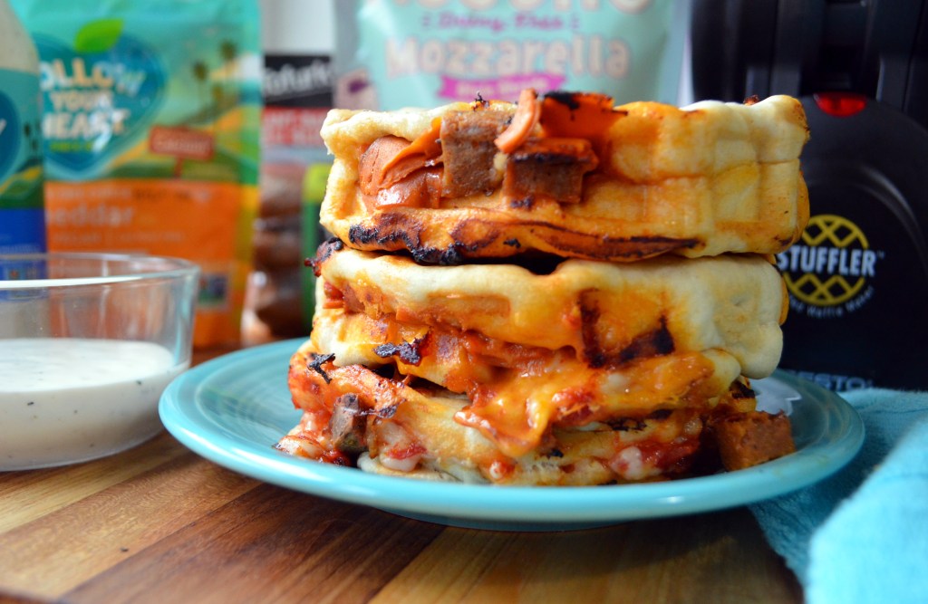 This month I joined the Waffle Club, and finally got myself a quality waffle maker. Just like any new appliance in my kitchen, I’m thrilled to play around with the options available with a waffle maker. Thus far I’ve waffled rice, hashbrowns, waffles, and tofu. However, I feel like these pizza stuffed waffles have been my greatest creation. Perfect handheld size for dipping or even packing on the go, and even good cold (just like regular pizza!) The new Moocho cheese is absolutely perfect for this, because it melts perfectly and oozes out the edges to crisp up nicely.